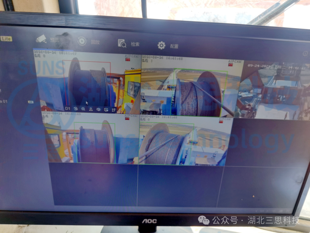 安裝AI攝像頭監(jiān)控卷揚(yáng)機(jī)的鋼絲繩排繩情況,在顯示器上可顯示鋼絲繩亂繩情況,若出現(xiàn)亂繩,顯示提示現(xiàn)場(chǎng)人員檢查。